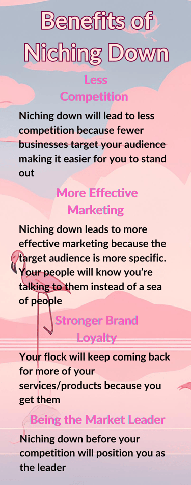 Niching Down has a bad rep. Some say it’s bad advice because it's not safe. It’s so much easier to serve a general audience to have good capital. But anyone who decides to start a business isn’t looking to play it safe. If that’s the case, we’d all be going back to working for someone we don’t like in a gray office praying our PTO will be approved. While it’s not easy, with solid marketing research and determination, it’ll help you in the long run. Don’t get me wrong, your niche needs to be specific AND there has to be a big enough market out there for it. The only way you find that out is through adequate market research.